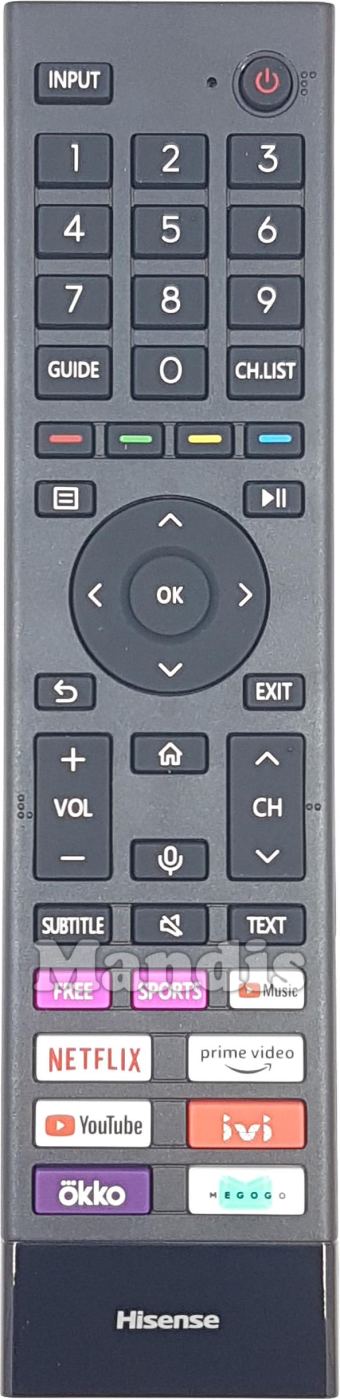 Input, Power, 1, 2, 3, 4, 5, 6, 7, 8, 9, 0, Guide, CH.List, Red, Green, Yellow, Blue, [=], Play, Pause, Up, Down, Left, Right, OK, Back, Exit, Home, Micro, Vol+, Vol-, CH Up, CH Down, Subtitle, Mute, Text, Free, Sports, Music, Netflix, Prime Video, Youtube, IVI, Okko, Megogo