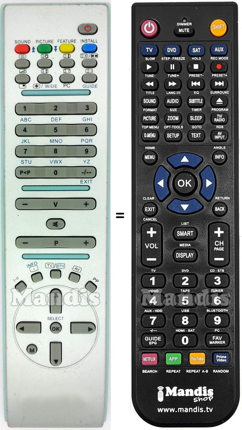 Ci-dessous, nous vous montrerons la correspondance entre chaque bouton de la télécommande d'origine et le bouton qui effectue la même fonction sur la télécommande de remplacement. Dans certains cas, vous devrez peut-être appuyer sur la touche SHIFT avant d'appuyer sur un autre bouton pour effectuer certaines actions. Ces fonctions supplémentaires sont souvent peu utilisées et sont incluses pour faciliter la compréhension de la télécommande de remplacement, ou parce que la télécommande d'origine comporte plus de boutons que son équivalent.