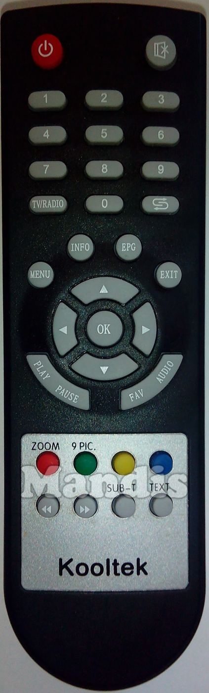 Power, Mute, 1 , 2, 3, 4, 5, 6, 7, 8, 9, 0, TV/Radio, Recall, Info, EPG, Menu, Exit, Up, Down, Left, Right, Ok, Play, Pause, FAV, Audio, Red/Zoom, Green/9 PIC., Yellow, Blue, <<, >>, SUB-T, TEXT