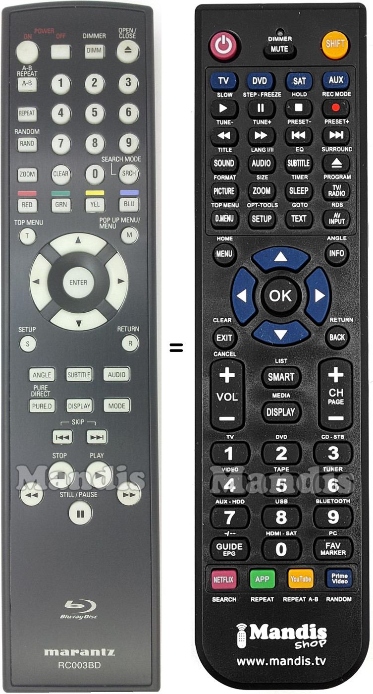 Cette télécommande remplace la plupart des fonctions de votre RC003BD. Il ne s'agit pas d'une télécommande universelle, mais d'une copie avec la plupart des touches et des fonctions de votre télécommande d'origine.