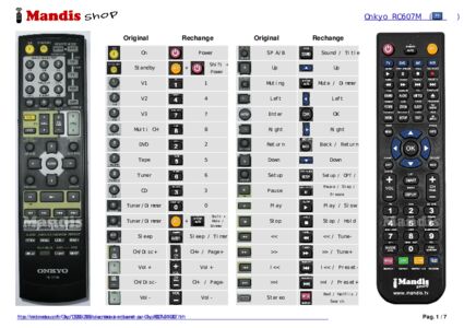 Cette télécommande remplit toutes les fonctions de la télécommande d'origine: On, Standby, Rem. Mode Receiver / Tape / AMP, Rem. Mode DVD, Rem. Mode CD / MD / CDR, Rem. Mode TV, Rem. Mode VCR, Rem. Mode SAT / CABLE, 1 / Inp. Sel V1, 2 / Inp. Sel V2, 3 / Inp. Sel V3, 4, 5 / Inp. Sel Multi CH, 6 / Inp. Sel DVD, 7 / Inp. Sel Tape, 8 / Inp. Sel Tuner, 9 / Inp. Sel CD, 0 / 11 / Dimmer, +10 / 10 / -/--, CLR / 12 / Sleep, TV Power, TV Input, TV Vol +, TV Vol -, TV CH + / Disc +, TV CH - / Disc -, Vol +, Vol -, Guide / Top Menu / SP A/B, Previous Menu / Muting, Up, Left, Enter, Right, Down, Return, Setup, Pause / Play Reverse, Play, Stop, <<, >>, I<<, >>I, Listening Mode Stereo, Listening Mode Surround, Listening Mode Prev., Listening Mode Next, Test Tone / Audio, CH Sel / Subtitle, Level - / Random, Level + / Repeat, Display, Play Mode, L. Night / HDD, Cine Fltr / DVD