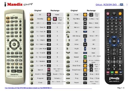 Cette télécommande remplit toutes les fonctions de la télécommande d'origine: ON, Standby, Mode Receiver, Mode TV/Setup, < Input Selector, Input Selector >, 1 / Last M / SP Setup, 2 / Cond.M / Test Tone, 3 / Func.M / CH Sel, 4 / Audio / SW Mode, 5 / Angle / Distance, 6 / Subtitle / Up, 7 / Late Night / IPM, 8 / T-D/ST / T-D Setup, 9 / Surround / Down, 0 / Random, +10 / --/---, Shift, Acoustic Control, Search, Program, Clear, Timer, Top Menu / TV Power, Menu / TV Input, Up / TV Vol+, Down / TV Vol-, Right / TV CH+, Left / TV CH-, Enter, Return / TV Muting, DVD Setup, Repeat, A-B, Step/Slow -, Step/Slow +, Stop, Play, Pause, << / Tuning-, >> / Tuning+, I<< / Tuner/Preset-, >>I / Tuner/Preset+, Mode MD/CDR/TAPE, MD/CDR/TAPE Play Rev./Pause, MD/CDR/TAPE Stop, MD/CDR/TAPE Play, Sleep, Dimmer, Display, Clock, Muting, Volume-, Volume+