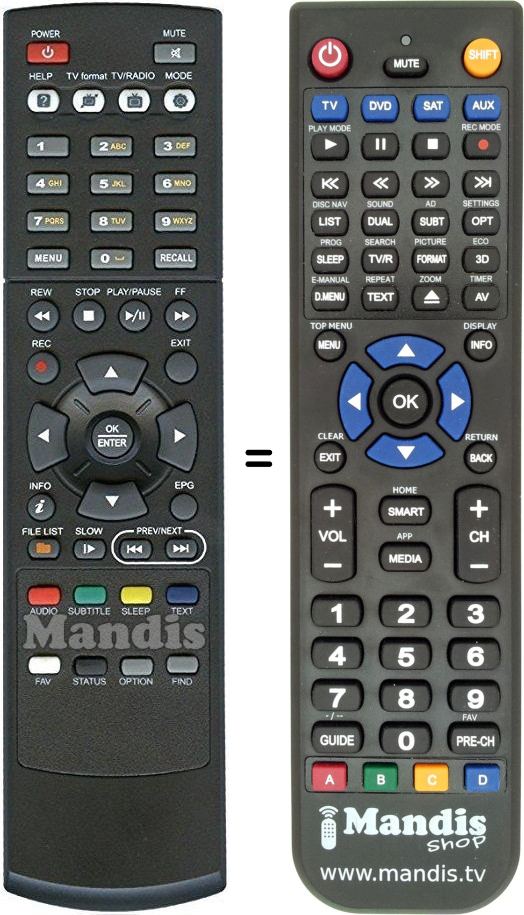 Power, Mute, Help, TV format, TV / Radio, Mode, 1, 2, 3, 4, 5, 6, 7, 8, 9, 0, Menu, Recall, << REW, Stop, Play / Pause, >> FF, Rec, Exit, Up, Left, OK / Enter, Right, Down, Info, EPG, File List, I> Slow, I<< Prev, >>I Next, Red / Audio, Green / Subtitle, Yellow / Sleep, Blue / Text, FAV, Status, Option, Find
