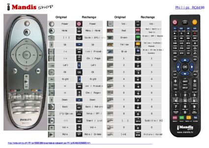 Cette télécommande remplit toutes les fonctions de la télécommande d'origine: Power, Home, [ I ], [*]/Option, >I, I<, OK, Up, Down, Right, Left, Back, III, Vol+, Vol-, Mute, Red, Green, Yellow, Blue, 1, 2, 3, 4, 5, 6, 7, 8, 9, 0, [...], [<>]