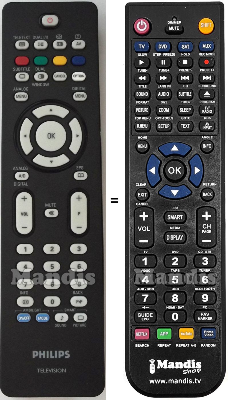 Cette télécommande remplit toutes les fonctions de la télécommande d'origine: Power, Teletext, Dual I / II, , AV, Red, Geen, Yellow, Blue, Subtitle, Dual Window, Cancel, Option, Menu Analog, Menu Digital, Up, Right, Down, Left, OK, Analog / Digital, EPG, Vol +, Vol -, Mute, P +, P -, 1, 2, 3, 4, 5, 6, 7, 8, 9, 0, Info, P<P / Back, Ambilight ON/OFF, Ambilight Mode, Sound, Picture