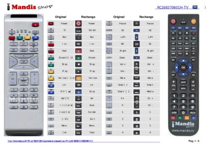 Cette télécommande remplit toutes les fonctions de la télécommande d'origine: Power, O / Rec, Mode, Red / I<<, Green / [[ ]] / Stop, Yellow / List / Play, Blue / PIP / >>I, AV / [?], I-II / [≡I≡], Aspect, [-O-], Menu, Text / Pause, Up, Right, Down, Left, OK, Vol +, Vol -, Mute, Smart Audio ♪, Smart Picture ▢, P +, P -, 1, 2, 3, 4, 5, 6, 7, 8, 9, 0, [i+], P < P