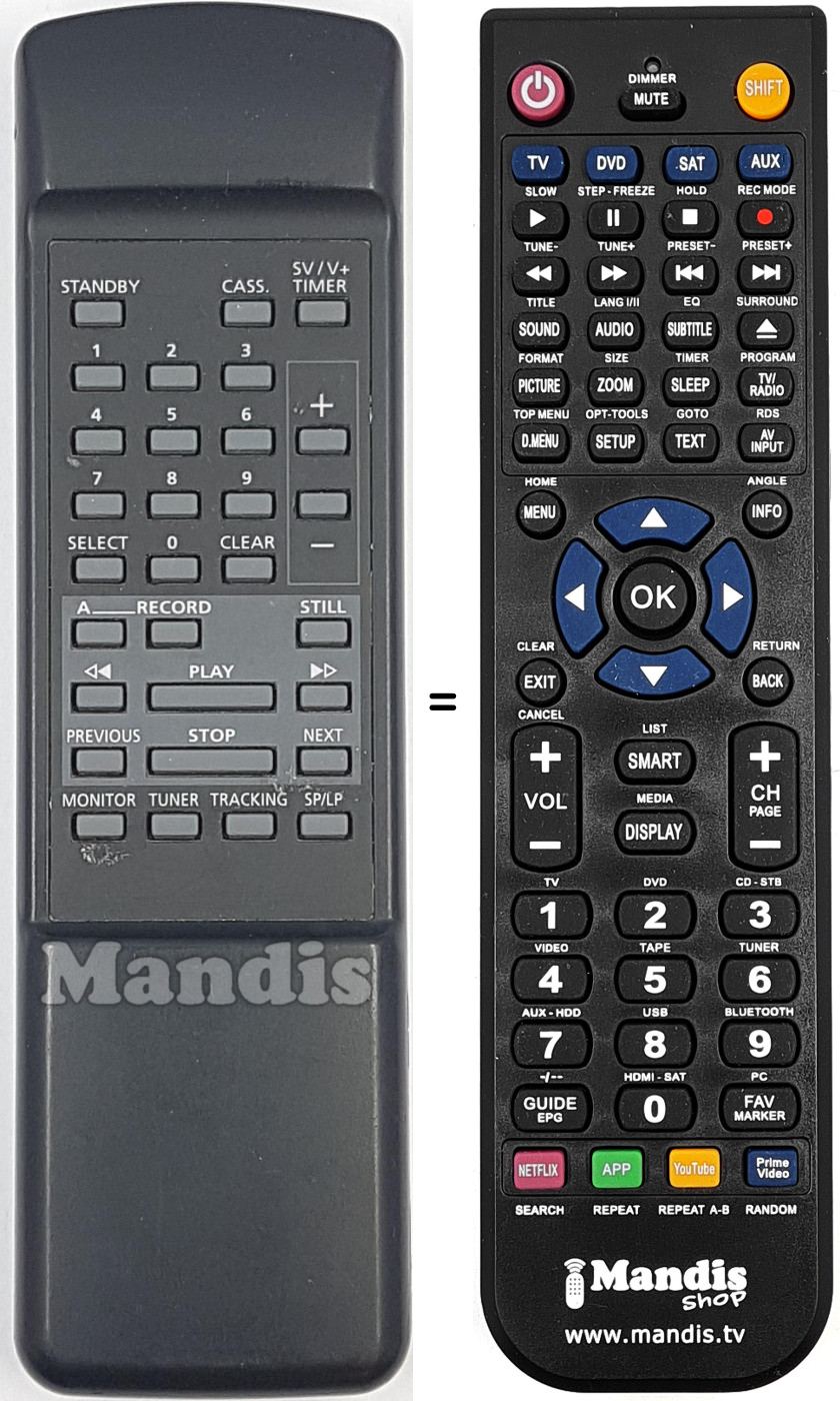 La télécommande équivalente exécute toutes les fonctions, même lorsque la télécommande d'origine commande divers appareils. Dans la télécommande équivalente, est possible de programmer différents appareils (TV, DVD, SAT et AUX) de manière à pouvoir inclure toutes les fonctions de la télécommande d'origine. Si vous voyez le manuel des touches (instructions de la télécommande), vous pouvez vérifier que toutes les fonctions sont présentes.