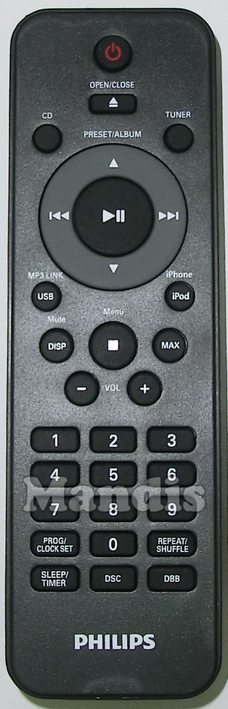 Power, Open / Close, CD, Tuner, Up / Preset + / Album +, Down / Preset - / Album -, Right / >>I, Left / I<<, OK / Play / Pause, USB / MP3 Link, iPod / iPhone, Disp / Mute, Stop / Menu, Max, Vol -, Vol +, 1, 2, 3, 4, 5, 6, 7, 8, 9, 0, Prog / Clock Set, Repeat / Shuffle, Sleep / Timer, DSC, DBB