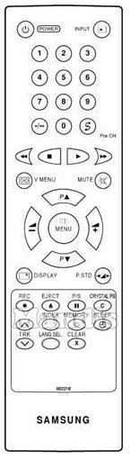 Input, Power, 1, 2, 3, 4, 5, 6, 7, 8, 9, 0, -/--, Pre-CH, <<, Stop, Play, >>, Mute, V.Menu, P.STD, Display, Up/P+, Down/P-, Right/Vol+, Left/Vol-, Menu, Rec, Eject, Pause/Step, TRK Up, TRK Down, Index, Memory, Crystal PN, Sleep, Clear, Lang.Sel