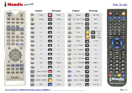 Cette télécommande remplace entièrement votre RC-882 et offre toutes les fonctions de l'originale.
